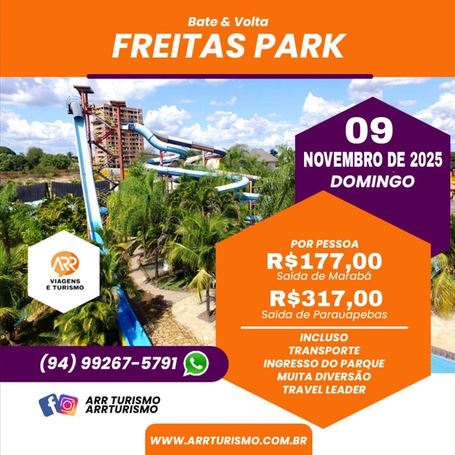 No dia 09 de Novembro de 2025, embarque em uma aventura refrescante para o Freitas Park Aquático em Imperatriz, MA. Este passeio bate-volta é perfeito para quem busca um dia cheio de diversão e relaxamento em um dos maiores parques aquáticos da região. Com transporte confortável, ingresso incluído e o acompanhamento de um monitor especializado, você só precisa se preocupar em curtir cada momento dessa experiência incrível. Venha se divertir com a ARR Viagens e Turismo e faça parte desta jornada repleta de alegria!